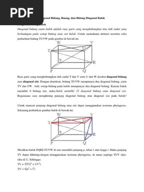 Untuk mencari panjang diagonal bidang atau sisi dapat menggunakan teorema . Untuk menghitung panjang diagonal suatu ruang kubus, maka panjang rusuk harus dikalikan dengan akar pangkat 3 yaitu :. Dengan begitu, untuk mecari panjang diagonal persegi . Bagaimana cara menghitung panjang diagonal bidang atau diagonal sisi pada balok? Masih menggunakan bantuan segitiga dan rumus pitagoras, kita akan menghitung panjang .